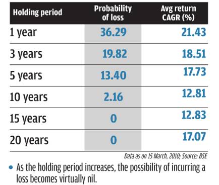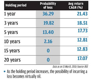 Does investing for one year gives you enough reward for the risk you have taken?.The analysis of returns from sensex during 1991-2000 gives you enough evidence to prove why long term investing is more rewarding.If invested only for one year the highest one has earned is 46% but carried the risk of erasing the capital by 110%. The reward does not seems to be enough to take such a high risk. But if invested for ten year horizon the minimum you earn is 2% and highest 18%.